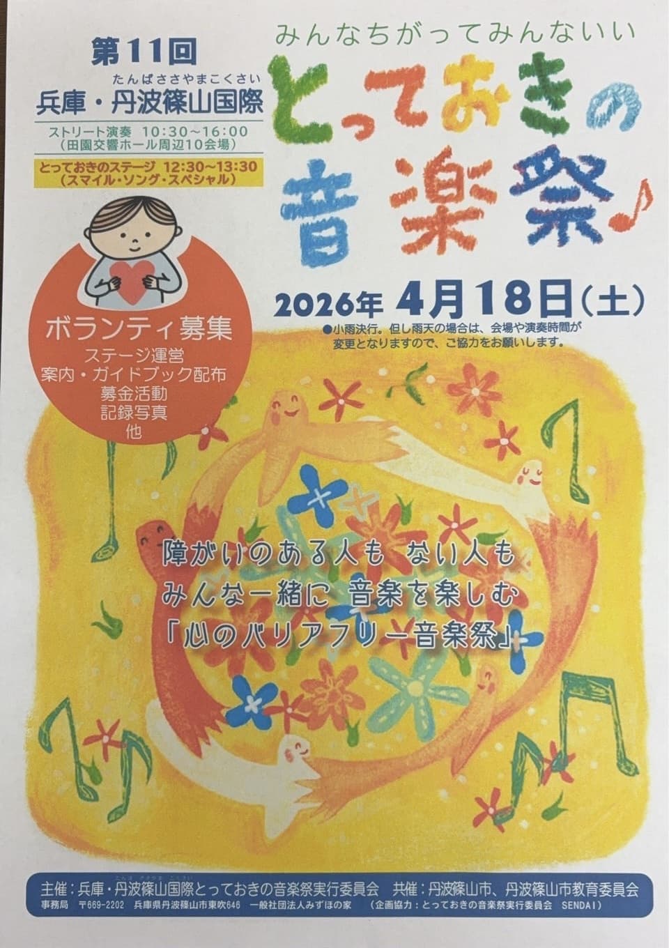 第11回! 丹波篠山国際とっておきの音楽祭出演決定! 【開催日時】 2026年04月18日(土) 10:30〜16:00 出演時間 時間:11:55-12:20 【会 場】 円応教篠山教会 ーーーーーーーーーーーーーーーーーーーーーーー 誰もが笑顔になる心のバリアフリーの音楽祭。 ぜひお越しくださいませ♪ 皆様の参加をお待ちしております。よろしくお願いいたします。